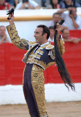 Precisamente, el primer acto del recital de Enrique Ponce en Quito tuvo lugar días pasado en la Belmonte, al que le siguió el segundo de hoy flanqueado por José Antonio Morante de la Puebla, y Curro Rodríguez al que dio la alternativa, culminándolo con una obra perfecta que mereció el premio de dos orejas y rabo concedidos por la presidencia de la corrida. Ello supone otro hito en la carrera de Enrique Ponce, en su temporada de las dos mil corridas y la de su vigésimo año de alternativa, en una plaza como la de Iñaquito donde difícil resulta recordar por los viejos del lugar cuando fue el último máximo trofeo que se concedió. Todos se remiten a unas tres décadas atrás; que si Armando Conde cortó uno, que si Palomo Linares otro, o que El Niño de la Capea. se hiciera con semejante trofeo por última vez. Pues nada, que a los tiempos, como gustan decir por acá, al cabo de treinta y tantas temporadas en la Iñaquito sin rabos en las manos de los toreros, a los veinte años de la presentación en este monumental coso de aquel precoz figurón de toreo, y tras haber sido sospechosamente ignorado en los tres últimos, llega el maestro de maestros y recuerda a unos ya otros cuáles son sus poderes, incluso a aquellos que por aquí andan aquerenciados en feria y que pusieron su pluma al servicio – más bien servilismo- de la causa de deidades pétreas señalando a Ponce como el enemigo a batir, y exigiendo su retirada del toreo con la vil ironía de desearle el gozo de un buen y merecido descanso. Mal día para las matildonas, que hasta aquí llegan los hilos de la telefonía móvil para las conexiones tomateras.